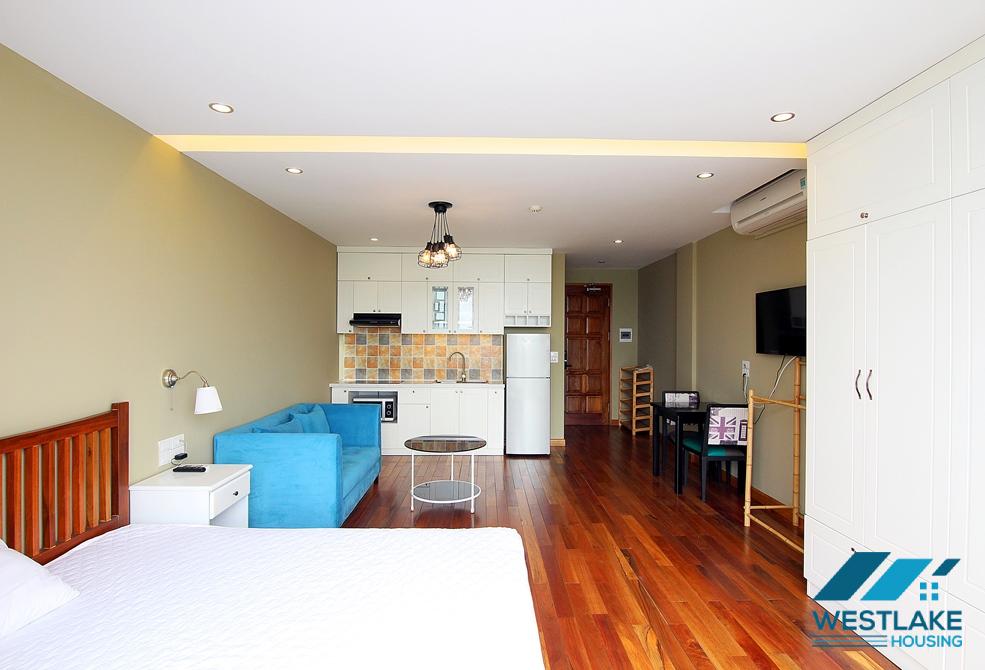 Cho thuê căn hộ Studio view hồ tại đường Âu Cơ, quận Tây Hồ. Căn hộ có diện tích 45m2, nằm trên tầng 5, gồm phòng khách và bếp mở, 01 phòng ngủ nhiều ánh sáng tự nhiên, 01 phòng tắm, ban công view hồ thoáng mát, đầy đủ đồ nội thất chất lượng. Nằm trên khu vực yên tĩnh, gần hồ, Công viên nước, phố đi bộ Trình Công Sơn và các nhà hàng, v.v.